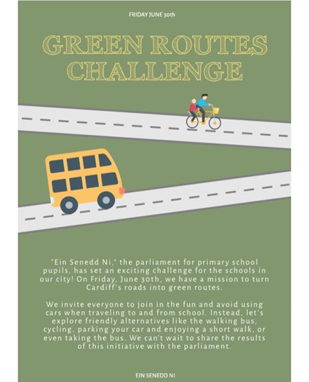 Ein Senedd Ni is the Primary Welsh Schools Parliament in Cardiff. Following a discussion in the Welsh Assembly on reducing carbon emissions and creating Green Routes in Cardiff the pupils decided to organise a challenge day. On the 30th of June pupils in the Welsh schools in Cardiff were all encouraged to actively travel to school. Representatives from each school then had a meeting in the afternoon to discuss the results and to discuss future initiatives.
