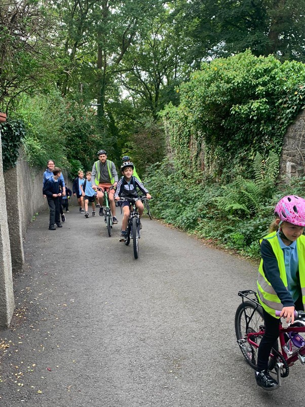 School staff, parents and children meet in Taffs Well, and the bike bus cycle together